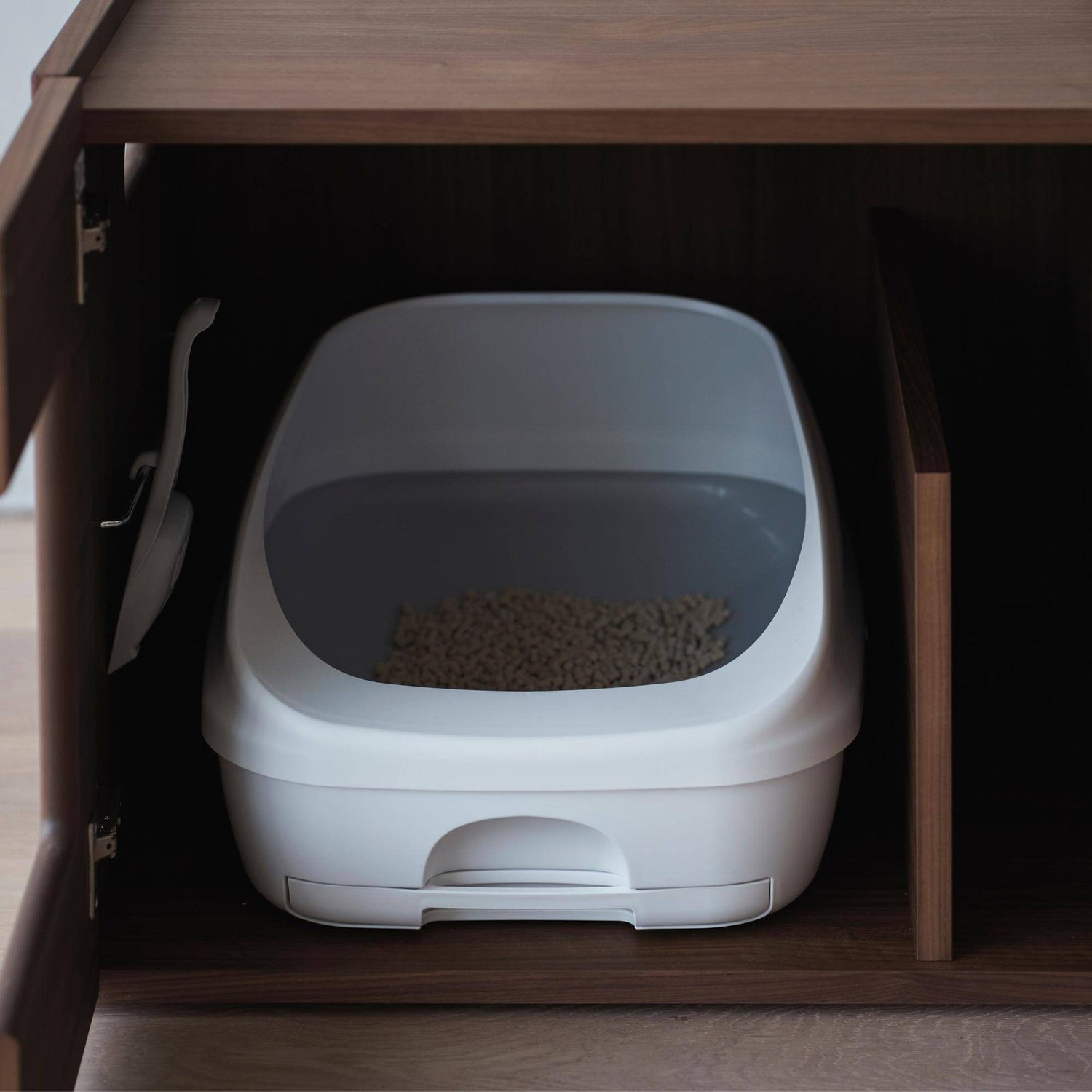 打開門後備有放置貓砂和除臭墊的收納空間也是一大特色,可看見木紋的表面塗裝,襯托木材的美麗樣貌,以提升裝飾性。