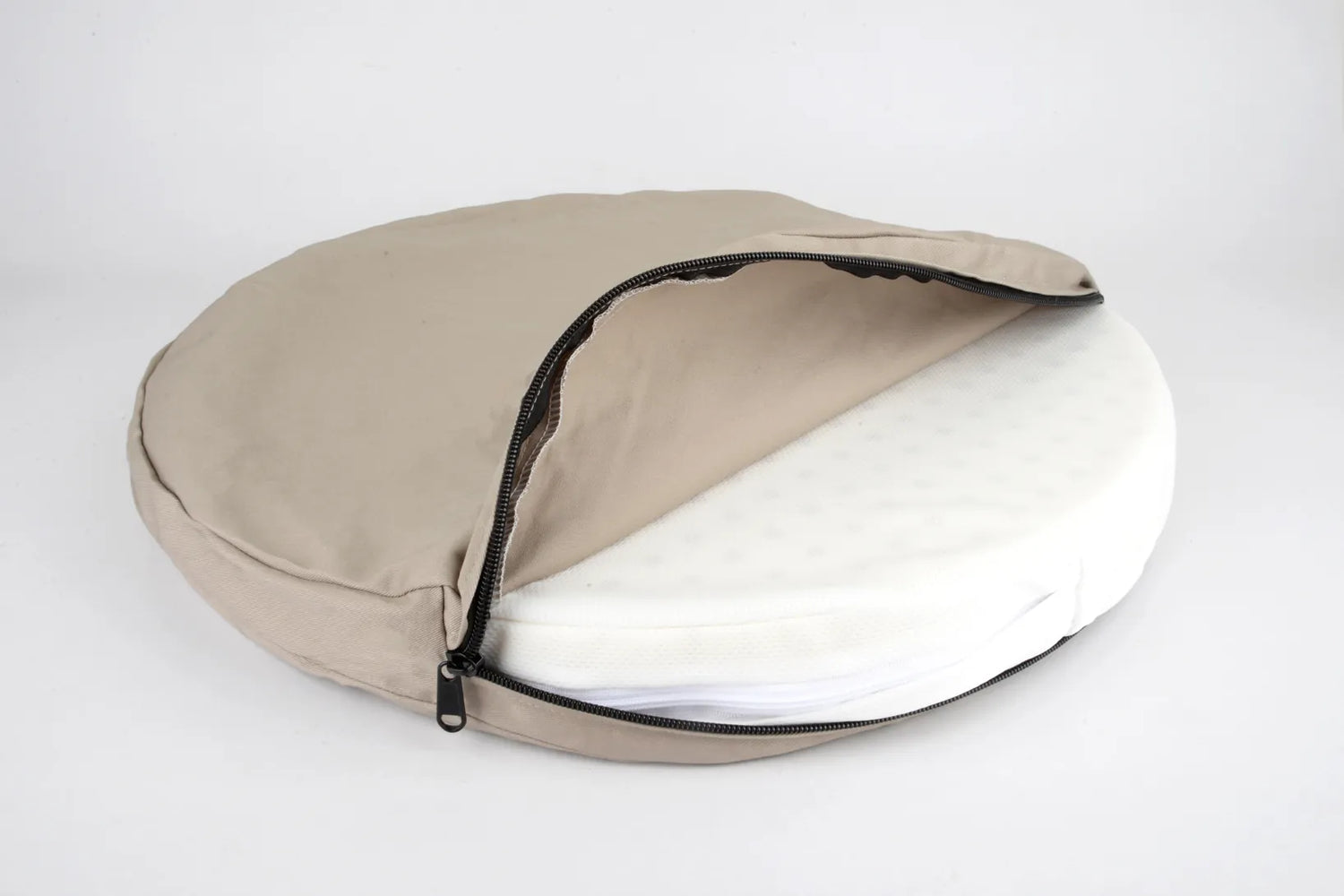 中間可拆式圓墊直徑47CM,嚴選斯里蘭卡天然乳膠墊柔軟Q能有效支撐毛孩關節與放鬆肌肉壓力